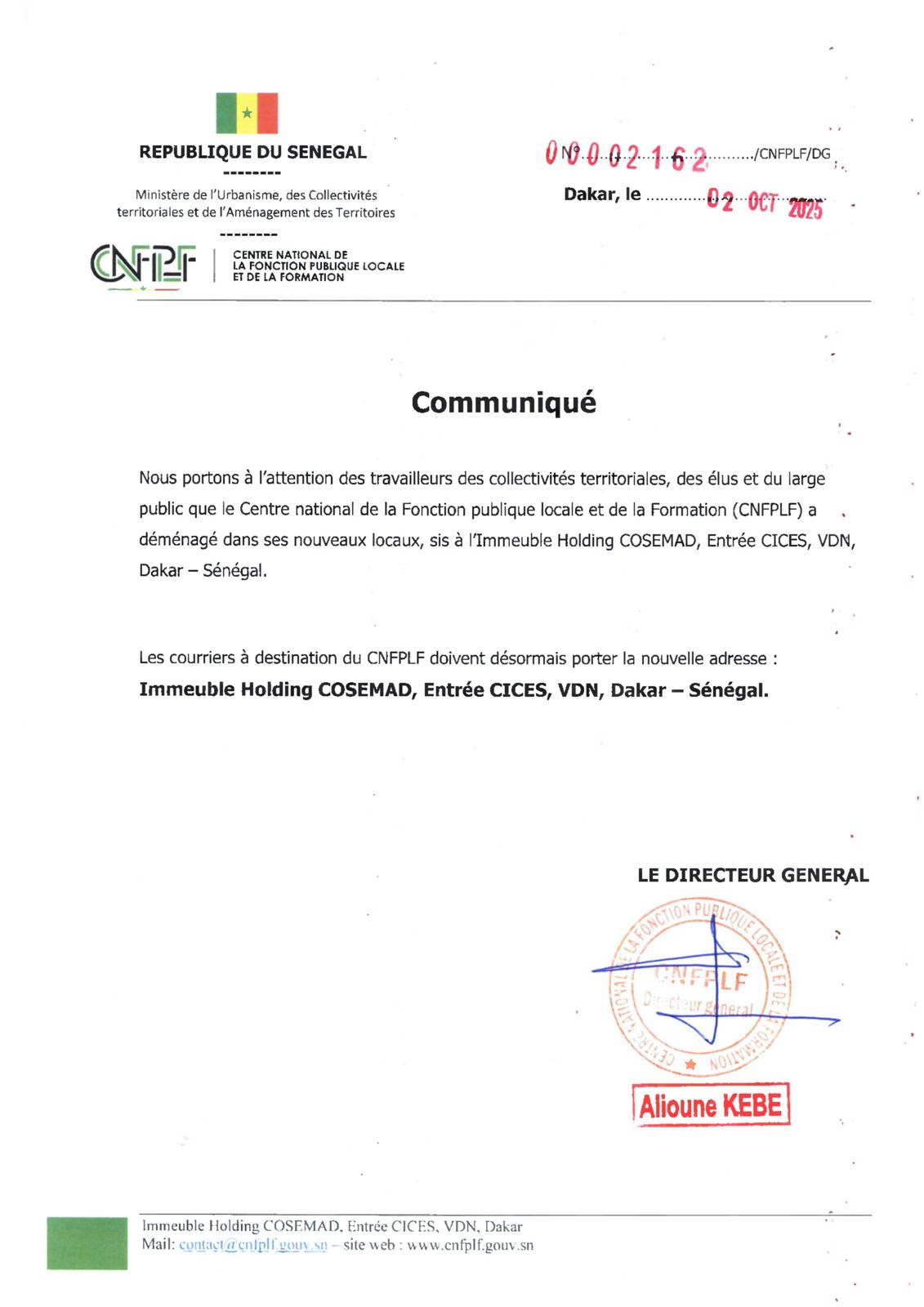 |   Immeuble Holding COSEMAD, Entrée CICES, VDN, Dakar – Sénégal       |       contact@cnfplf.gouv.sn       |
