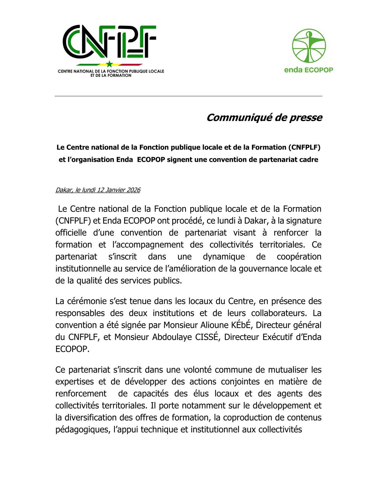 Le Centre national de la Fonction publique locale et de la Formation (CNFPLF) et l’organisation Enda ECOPOP signent une convention de partenariat cadre
