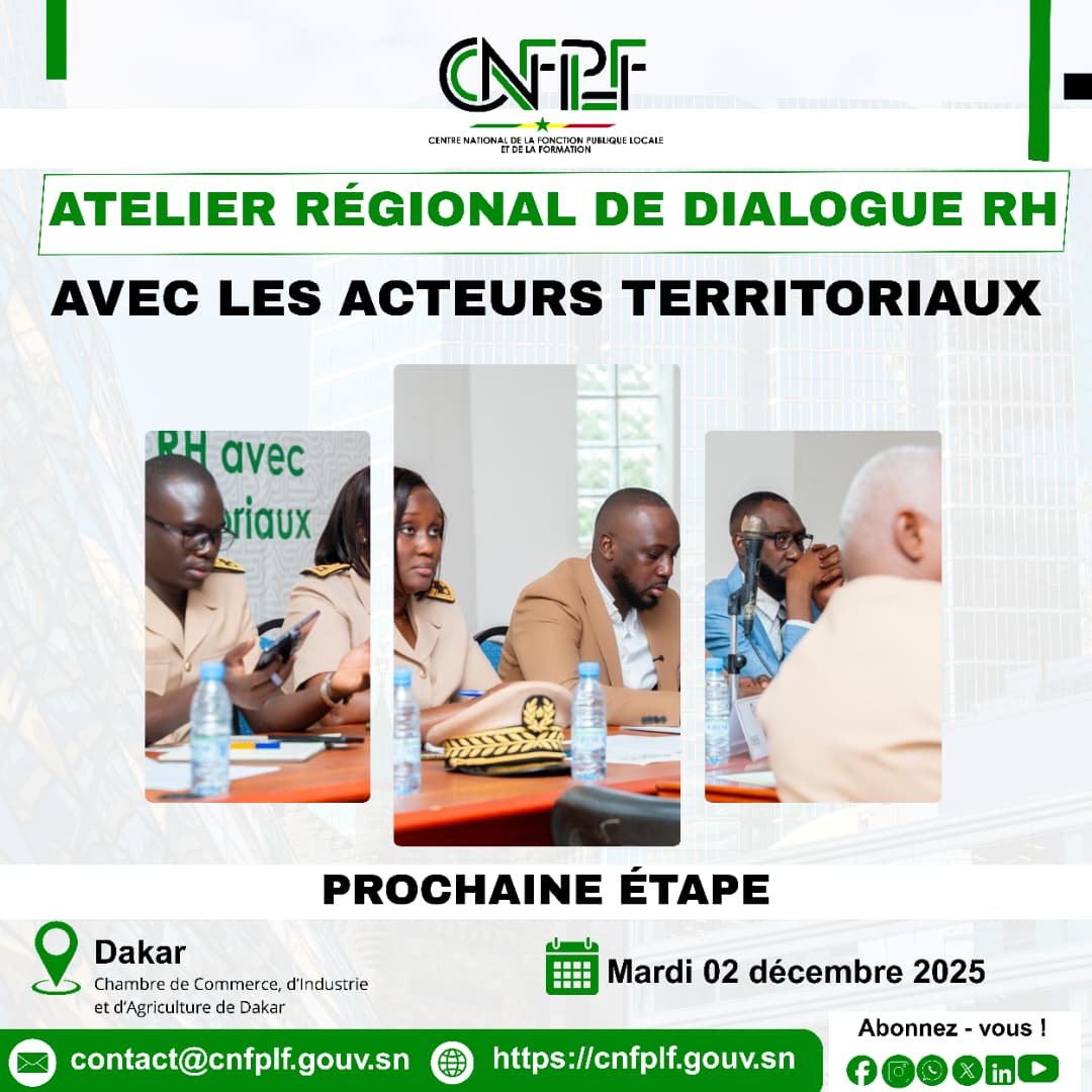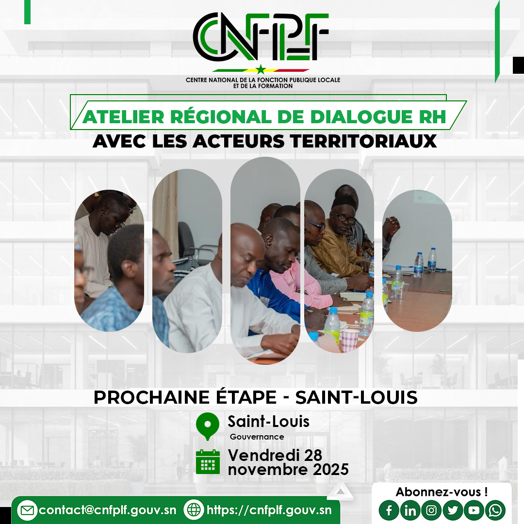 Gouvernance de Saint-Louis Gouvernance, Saint-Louis, Senegal➡ATELIER RÉGIONAL DE DIALOGUE RH Prochaine étape : 📍Lieu : Gouvernance de Saint-Louis 🎯 Cibles : les Autorités administratives, exécutifs locaux, payeurs publics, services publics déconcentrés. 📆Date : Vendredi 28 novembre 2025 💡Pour en savoir plus sur le CNFPLF et ses offres, consultez notre site internet 🌐 https://cnfplf.gouv.sn ____________ 📲 Restez connectés sur les plateformes du CNFPLF pour suivre toutes nos actualités : https://linktr.ee/cnfplf __ #CNFPLF #centrenationaldelafonctionpubliquelocaleetdelaformation #collectivitesterritoriales #ressourceshumainesterritoriales #formation #fonctionpubliquelocale #DialogueRH #AtelierRegionalDeDialogueRH